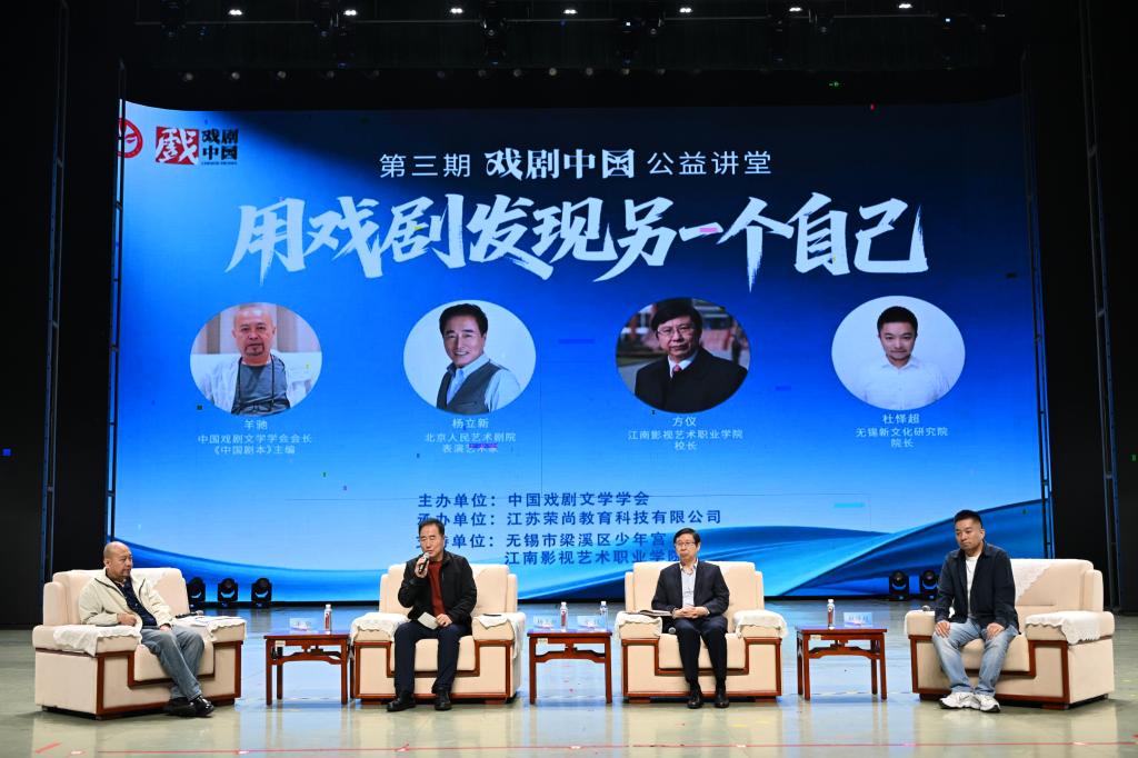 4月20日,由中国戏剧文学学会主办,无锡市梁溪区少年宫、江南影视艺术职业学院支持的第三期“戏剧中国”公益讲堂在江南影视艺术职业学院彩虹剧院精彩开讲。本期讲堂邀请到中国戏剧文学学会会长、《中国剧本》主编羊驰,北京人民艺术剧院表演艺术家杨立新,江南影视艺术职业学院院长方仪,无锡新文化研究院院长杜怿超作为对话嘉宾来到现场,以“用戏剧发现另一个自己”为主题,围绕戏剧文脉传承、校园戏剧教育、舞台表演技艺、戏剧人才培养等多重维度与现场观众展开交流与探讨。
