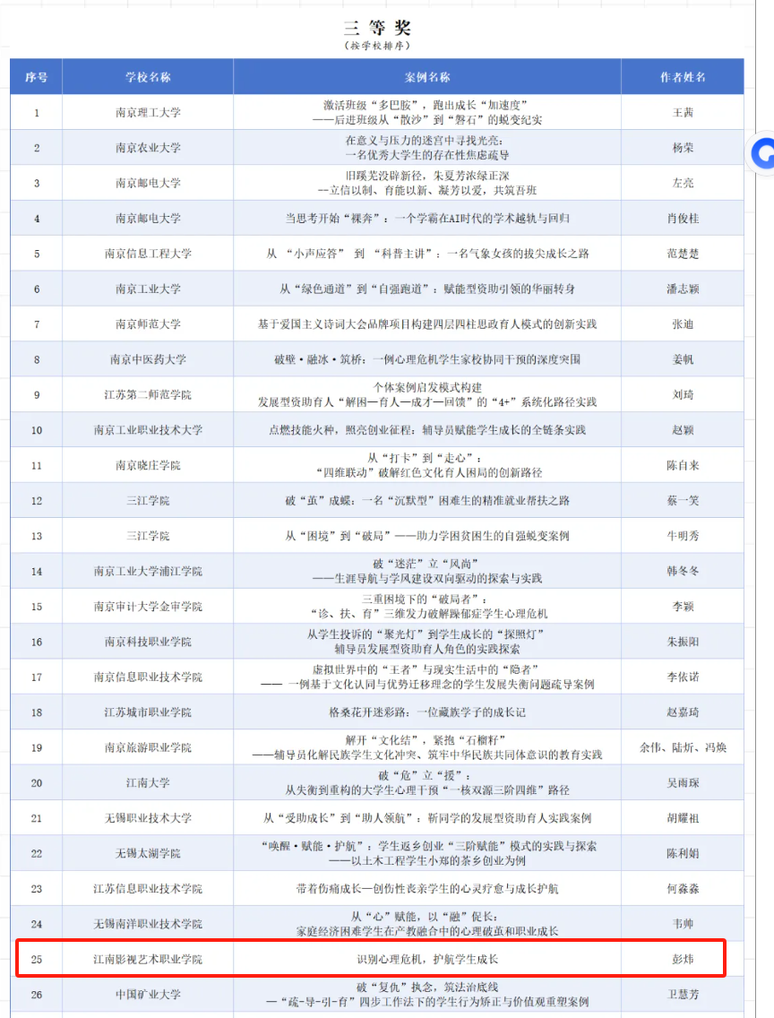 近日,江苏省高等教育学会辅导员工作研究委员会公布了2025年高校辅导员工作案例遴选结果。我校彭炜老师提交的工作案例《识别心理危机 护航学生成长》荣获三等奖。彭炜老师的获奖,展现了我校辅导员队伍扎实的业务能力和良好的专业素养。